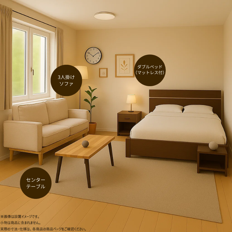2人暮らし家具4点セット 5年契約 ¥5,570(税込) /月 数量 4年契約 ¥6,240(税込) /月 数量 3年契約 ¥7,330(税込) /月 数量 2年契約 ¥9,540(税込) /月 数量 1年契約 ¥16,140(税込) /月 数量 ダブルベッド(マットレス付) センターテーブル 3人掛けソファ