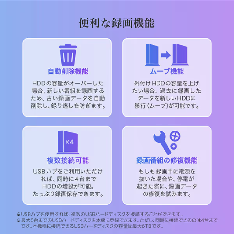 外付けHDD録画(最大8台登録、同時4台接続可能)