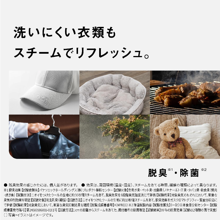 平均 15g/分のパワフルスチーム を実現し、頑固なシワをきれいに伸ばすだけでなく、衣類の 脱臭・除菌・花粉やアレル物質の抑制 にも対応。