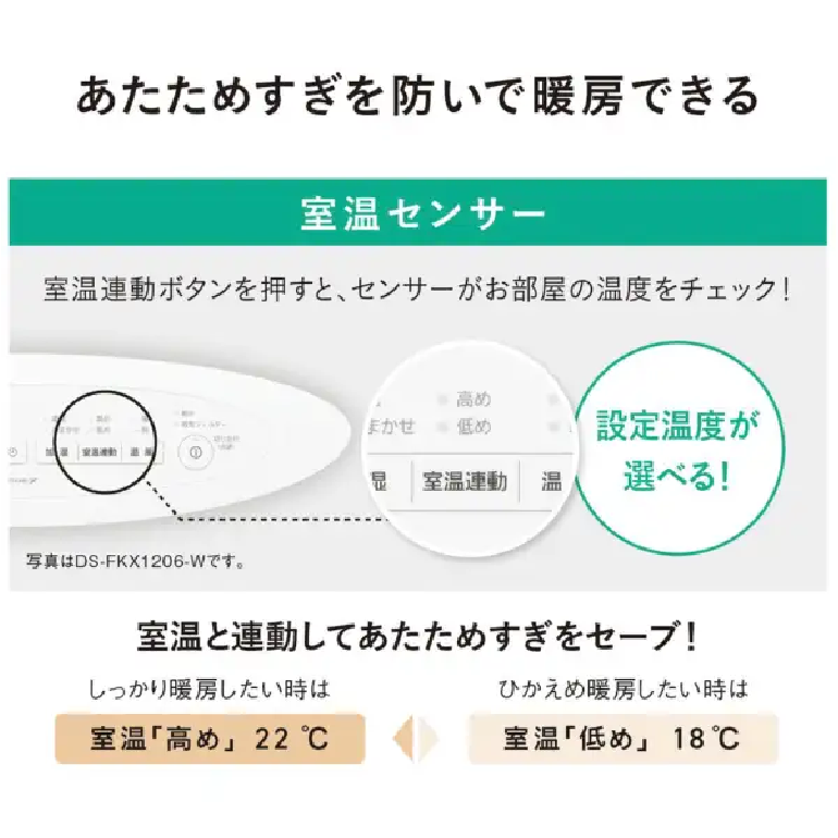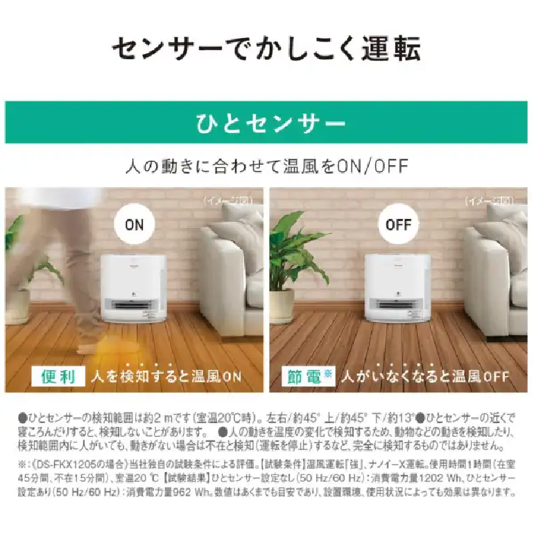 また、人の動きを感知して自動で温風をON/OFFする「ひとセンサー」、室温を検知して暖めすぎを防ぐ「室温センサー」を搭載。ムダな電力消費を抑えつつ、心地よいあたたかさをキープできます。