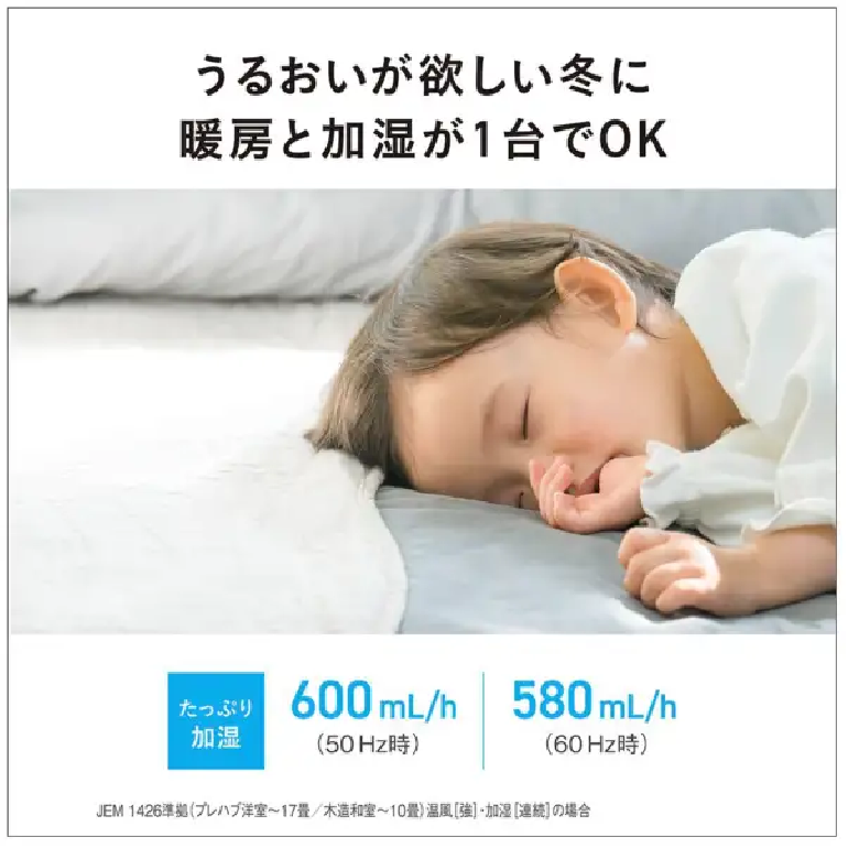 1時間に約600mL(50Hz時)の加湿量で、乾燥しやすい季節でも快適な湿度をキープ。