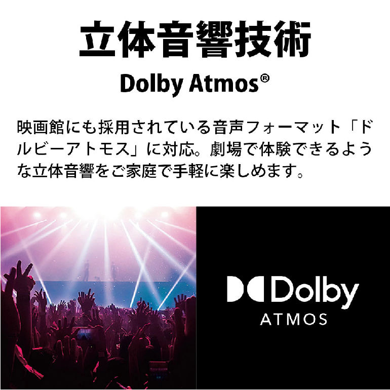 オーディオはバスレフ型スピーカーボックスを採用し、Dolby Atmosにも対応。
