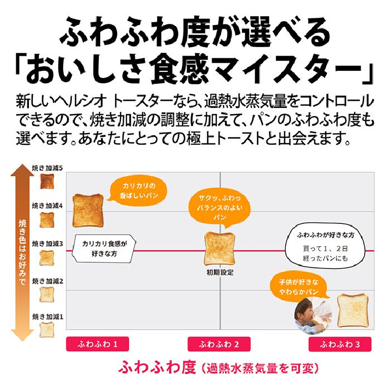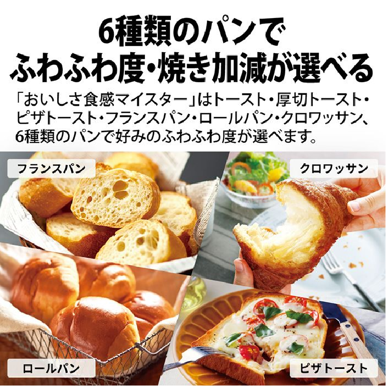 好みに合わせて「ふわふわ」「もちもち」「カリッ」の3段階から選べる「おいしさ食感マイスター」機能を搭載。