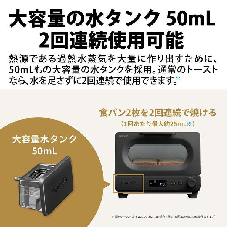 一度の給水でトーストを2枚×2回連続で焼ける大容量設計。