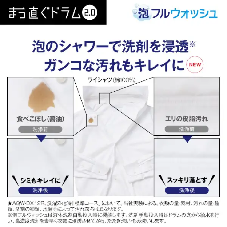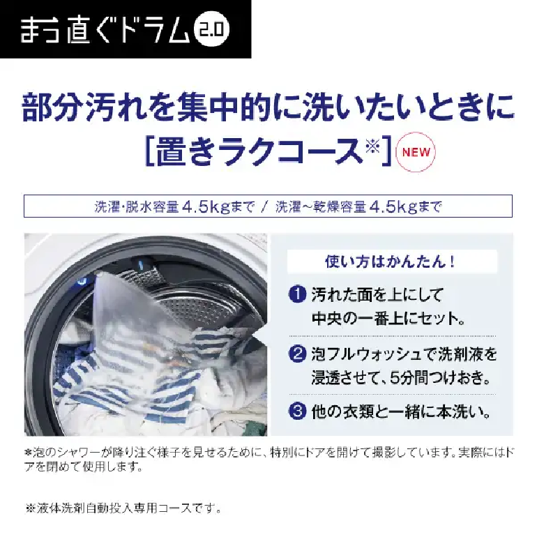 泡のシャワーで洗剤液を繊維の奥までしっかり浸透させ、頑固な汚れもスッキリ落とす高性能ドラム式洗濯乾燥機。