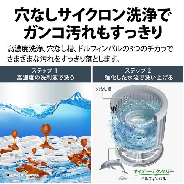 穴なしサイクロン洗浄は、高濃度洗浄・穴なし槽・ドルフィンパルの3つの力で、衣類をしっかりもみ洗い。
