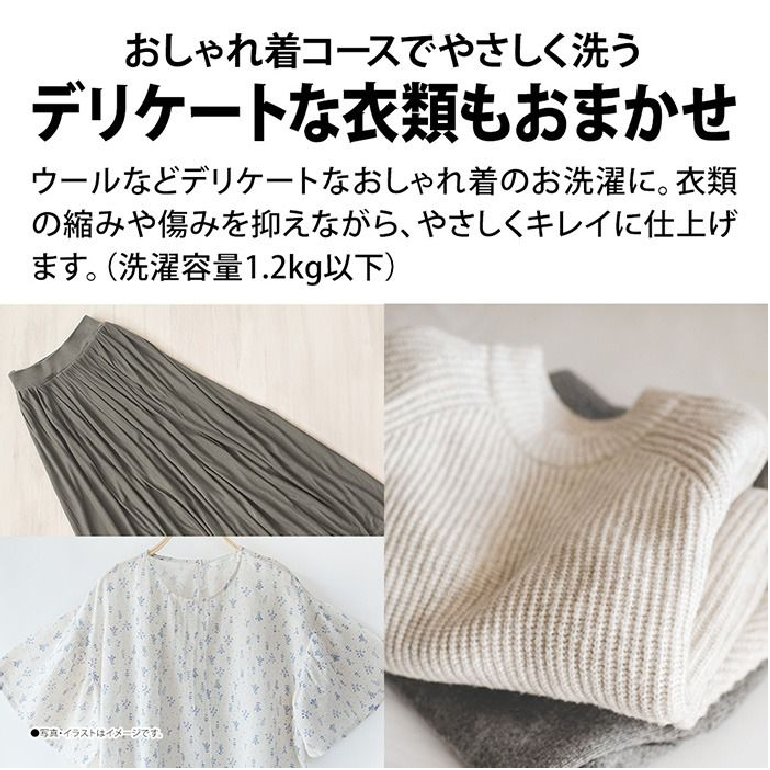 おしゃれ着コースでは、ウールなどの繊細な衣類を縮みや傷みを抑えながら丁寧に洗浄。