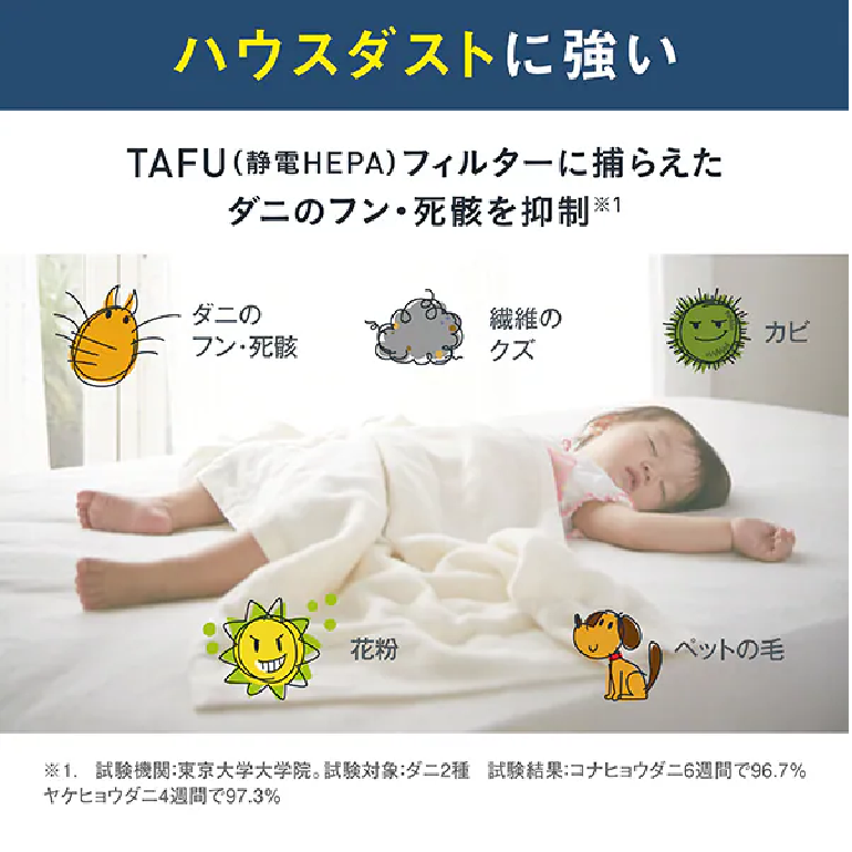 抗菌加湿フィルター、TAFU(静電HEPA)フィルター、脱臭フィルター、プレフィルターの4層構造で微細なホコリや花粉、ニオイまでしっかり吸着。