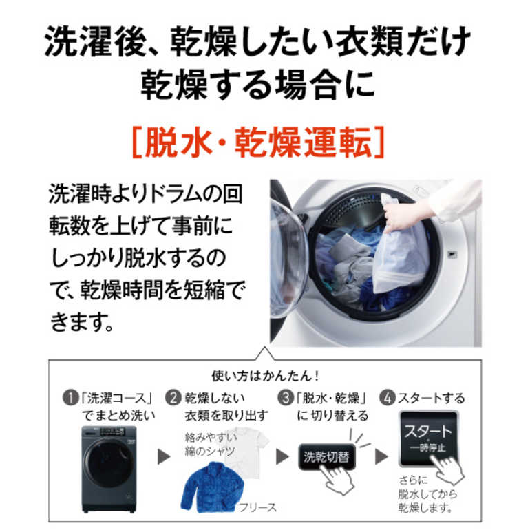 必要な衣類だけを乾燥できる「脱水・乾燥運転」により乾燥時間の短縮も可能です。