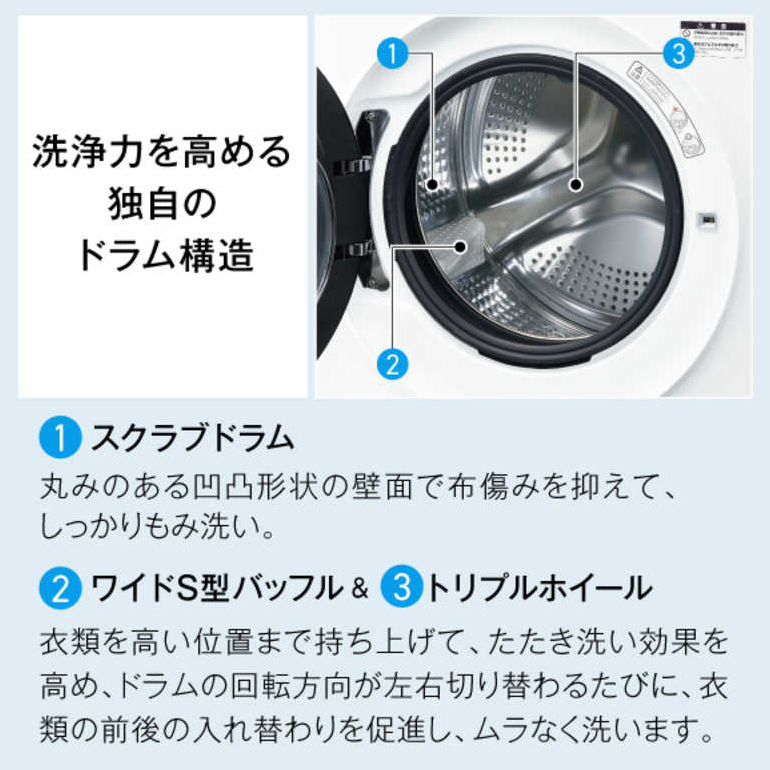 洗濯のたびに見えない部分まで清潔を保ち、黒カビや汚れの発生を抑制。