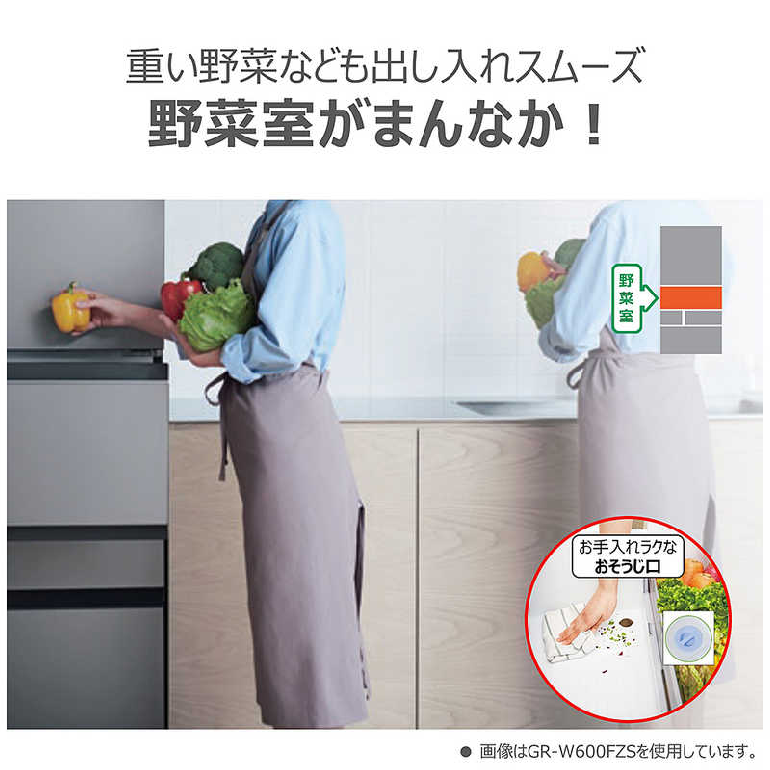 最大の特長は、野菜をみずみずしく保存できる「もっと潤う 摘みたて野菜室」。